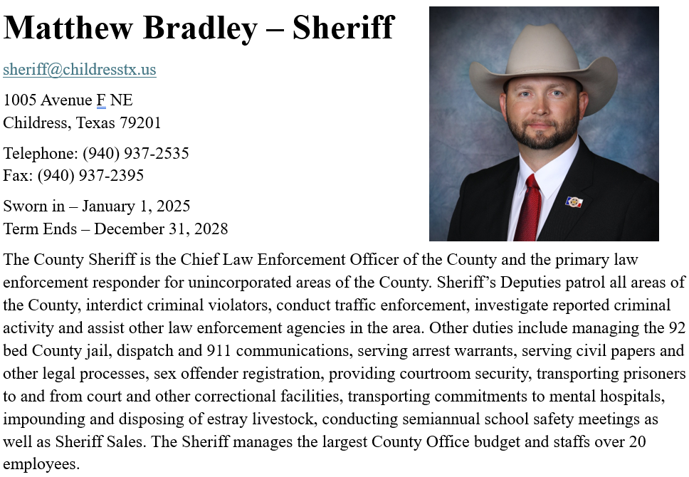 All records requests must be in writing. They may be delivered in person or by mail to 1005 Avenue F NW Childress Texas 79201, or by email sent to sheriff@childresstx.us.