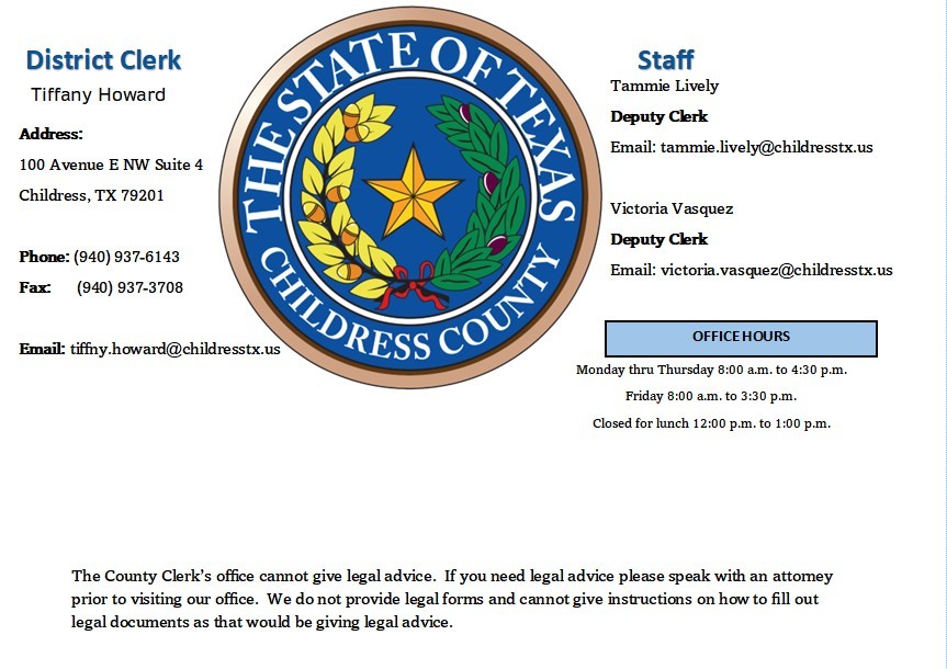 The Childress County Clerk's office provides this web site as a public service. Information available on this web site is collected, maintained and provided solely for the convenience of the public users. While every effort is made to assure that this information is accurate and current, the County Clerk does not certify the authenticity of the information contained herein. The County Clerk shall under no circumstance be responsible for any error or omission which may occur in these records, nor liable for any actions taken as a result of reliance upon any information contained within this web site from whatever source, or any other consequence from such reliance. Images may be unavailable while system backups are in progress.